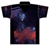 湧き出る赤と青のポイントが黒を引き立てていて、ライトアップされた景色のようなウェアです。